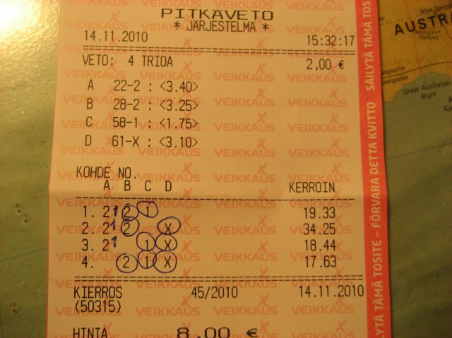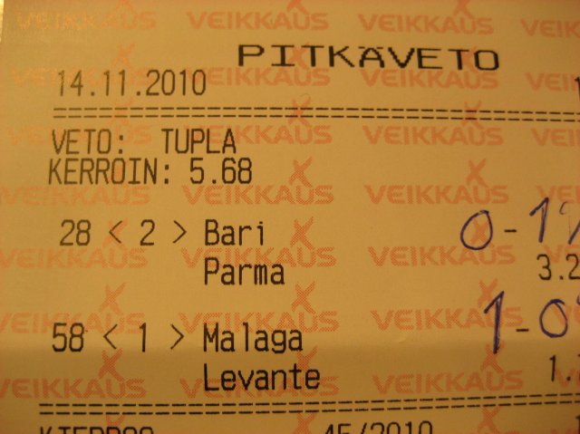 Neljännen kohteen hakeminen oli vähän vaikeampaa & tein 3 järjestelmää näiden 3 kohteen kautta ja vaihtelin aina neljännen kohteen joka oli aina pieni ylläri. Italian Serie A:n vierasvoittoja sinne hain hyvillä kertoimilla mutta ne eivät pitäneet :/ Kuitenkin joka järjestelmästä tuli positiivinen tulos kun nämä peruskohteet osuivat tosiaan kaikki.. =)