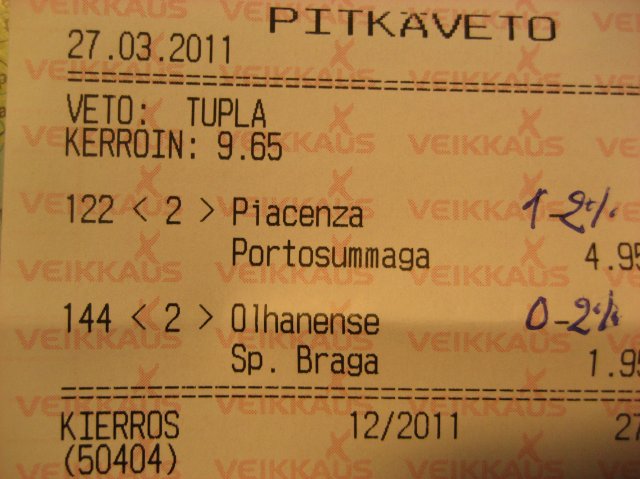 Niin sunnuntai oli nyt vetoviikonlopun paras päivä. Lauantaina sain Vakioveikkauksessa 4 euron systeemillä taas kerran sen 10 oikein & hyvän mielen että jäljillä oltiin taas jalkapallon EM-karsintaotteluissa + ystävyysotteluissa. Mutta alasarjat olivat se paras rahantekijä tällä kertaa ja etenkin tuo Italian Serie B sunnuntaina. Pelasin tällä kertaa lähinnä Veikkaukselle sillä siellä oli pari kerrointa hieman koholla. Viikonlopun helmikohde oli putoamista vastaan taisteleva Portosummagan vierasvoitto kertoimella 4.95 ! Kerroinvertailun perusteella Veikkauksen tarjous oli selvä ylikerroin odotusarvolla 104 wau ! Veikkaus joutuikin pudottamaan kerrointa 4.20:neen, mutta onneksi olin jo ajoissa liikenteessä ! =)