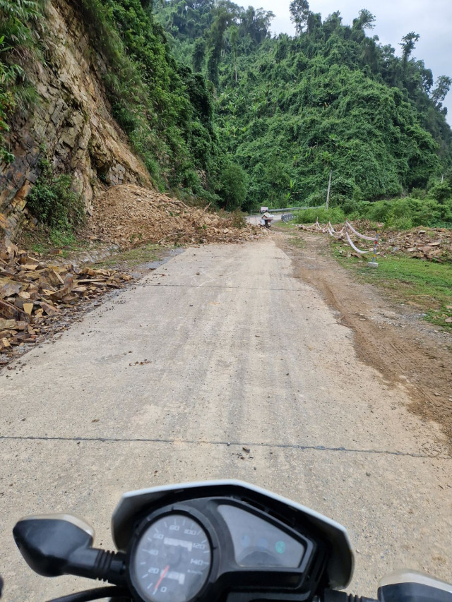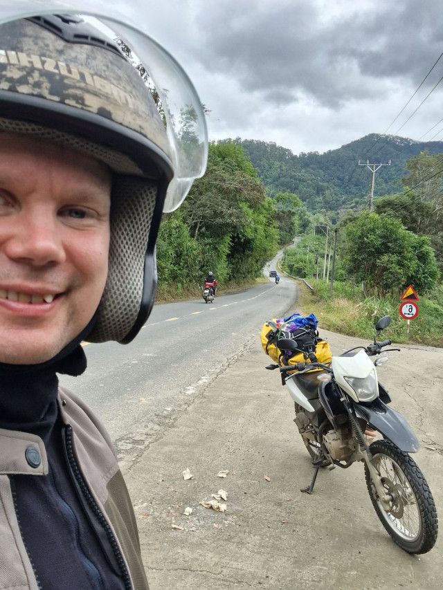Erään serpentiinimutkan jälkeen tuuli yltyi niin kovaksi, että pelkäsin pyörän kaatuvan. Vettä satoi entistä kovemmin ja sitä virtasi tien yli vähän väliä. Tuuli heitteli vettä niin rajusti että välillä vettä satoi myös alhaalta ylöspäin ja visiirikin kastui sisäpuolelta. Mutka mutkan jälkeen vettä oli enemmän ja vettä valui kallioita pitkin yhä runsaammin. Sitten erään mutkan jälkeen alkoi jono. Ihmiset odottivat paikallaan. Ajoimme jonon ohi ja tie oli sortunut kokonaan ajokelvottomaksi. Vettä tulvi tien yli niin vuolaasti ettei edes meidän ryhmän kokenein endurokuskikaan uskaltanut lähteä kokeilemaan. Osa asfaltista puuttui ja vesi oli kuin kuohuva vuolas koski.