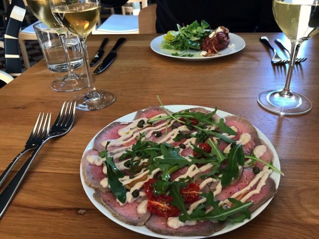 Alkuruoaksi tilaan Vitello tonnaton, joka on ehdottomasti lajissaan paras, jonka olen koskaan syönyt. Annos on raikas ja siinä on paljon pehmeitä makuja, joita hieman kirpeät tomaatit raikastavat kivasti. Seuralaiseni alkuruokatartar yllättää koollaan. Lautasella on reilusti syötävää ja tartariin on jätetty paljon purutuntumaa.