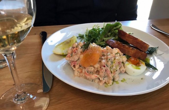 Päädyn myös itse lähes poikkeuksetta tartarin, jos sellaista on tarjolla ja se onkin ehdoton valintani pääruoaksi. Kuitenkin seuralaiseni pääruoakseen valitsema Toast skagen ennättää saapuessaan herättää minussa hieman annoskateutta. Ei tartar kuitenkaan jää sen varjoon. Annoksessa on niin paljon lihaa, että tavoistani poiketen harkitsen jo hetken jättäväni jälkiruoan väliin.