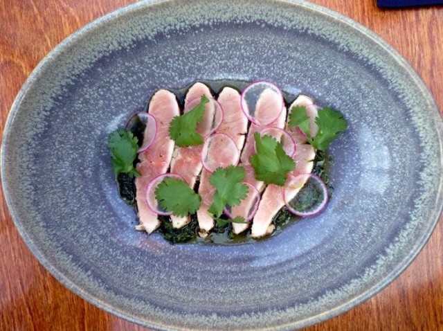 Avecini kalapääruoka yhdistettiin Aztec Lemonade #3 kanssa, johon mezcal ja tyrnipontikka tekivät vahvan ja savuisen maun. Annoksen kevyesti savustettu ranskankerma toimi kalan sekä ruuan kanssa tarjoiltavan juoman kanssa mainiosti.