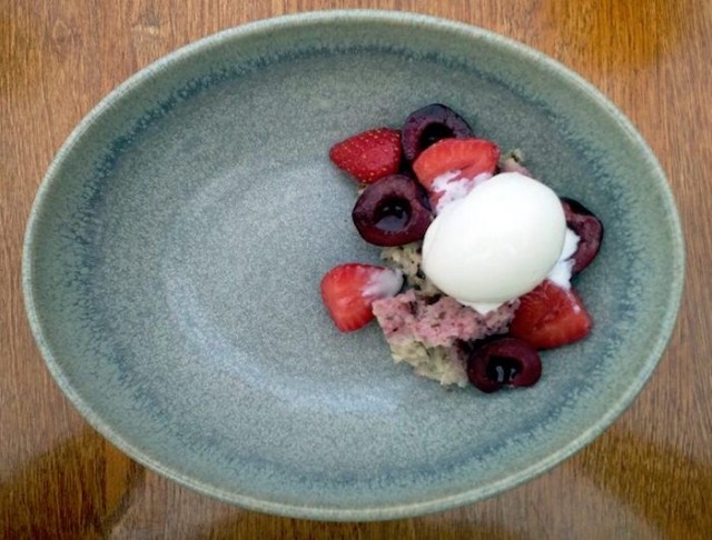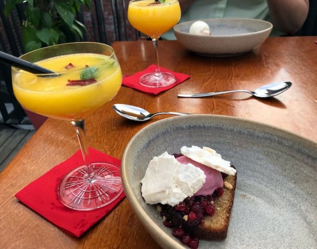 Jälkiruoat noudattelivat aiempien annosten kesäistä teemaa. Tislaamon viskin teossa käytettyjä maltaita oli kekseliäästi ja ekologisesti hyödynnetty toisen jälkiruoan leipämäiseksi kakuksi, joka toi mukavasti tasapainoa makeille mansikoille, kirsikoille ja jäätelölle. Leipäkakku toi lisäksi miellyttävän suutuntuman annokseen. Myös toiseen jälkiruokaan oli yhdistetty kakkua, jota puolukka-ginijäätelö raikasti. Molempien jälkiruokien kanssa suositeltiin cocktailiksi Mango Daisya, jonka mangosorbetti toimi jälkiruokana jo itsessään, nam! Kolmen ruokalajin illallisen annoskoot toimivat hyvin, illallisen jälkeen oli täysi ja kylläinen, mutta ei liian ähky olo.