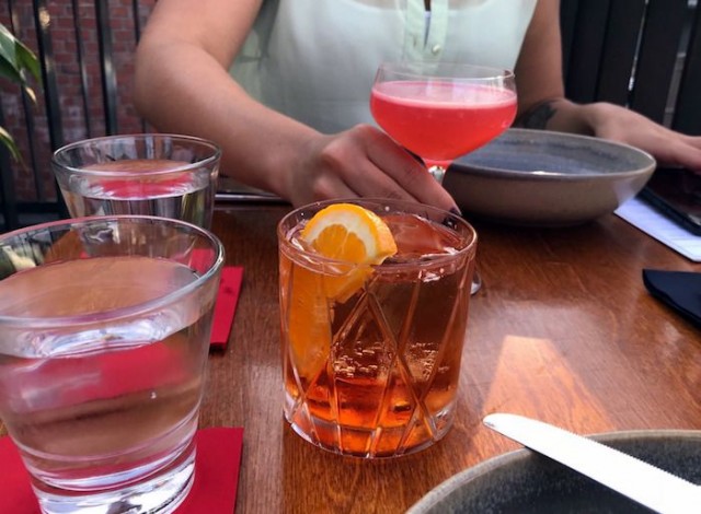 Avecini alkuruoan kesäinen ja kevyt kala oli kuulemma sopivan mureaa ja maut toimivat hyvässä tasapainossa korianterin tuoden kivaa potkua makuihin. Myös tarjoilijan ehdottaman Evening in Rome -drinkin kehuttiin toimivan kalan kaverina äärimmäisen hyvin. Cocktailin maku on kevyen kirpeä, jonka ansiosta se toimi alkupalakalan hyvänä parina. Vaaleanpunainen juoma oli myös esteettisesti kaunis.