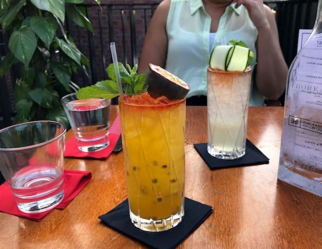 Kuten tislaamossa kuuluukin, sivuutamme ruokajuomina viinit ja muun tuontitavaran ja nautimme annoksillemme sovitettuja cocktaileja. Aperitiiviksi saamme mainion lempeän gin tonicin, joka sopi helteiseen alkuiltaan.