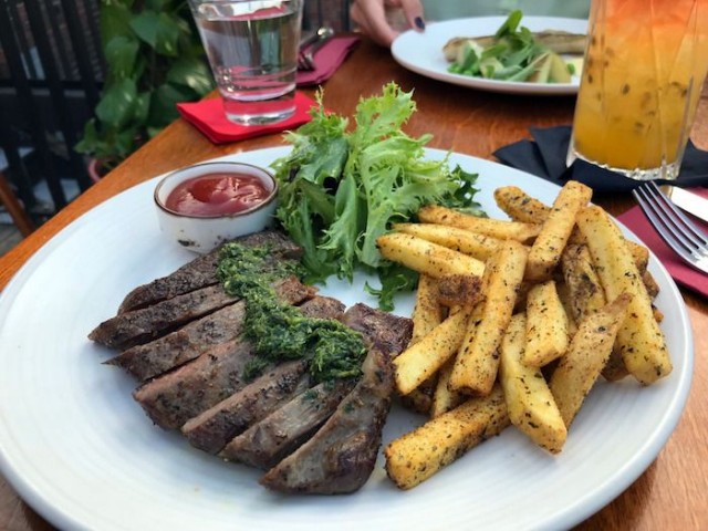 Myös pääruoan liha jatkoi laadukasta linjaa ja annoksessa oli paljon syömistä. Varsinkin, kun mausteisista ranskalaisista söi mielellään ihan jokaisen. Pääruoan kanssa sain Summer of ’69 -cocktailin, jonka tiesin jo passionhedelmäisen ulkonäön perusteella nousevan suosikikseni.
