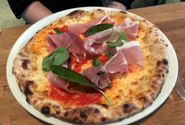 Vaikka muitakin vaihtoehtoja on tarjolla, ovat pääruokavalintamme alusta saakka selvät ja haluamme molemmat maistaa ravintolan mahtavantuoksuisia pitsoja. Pitkän harkinnan jälkeen jatkamme raaka-aineiden suhteen klassisella linjalla ja toisen pitsan täytteiksi valikoituu kirsikkatomaattia, puhvelimozzarellaa, basilika ja yrttisalsa ja toisen täytteeksi mozzarellaa, parmankinkkua ja basilikaa.