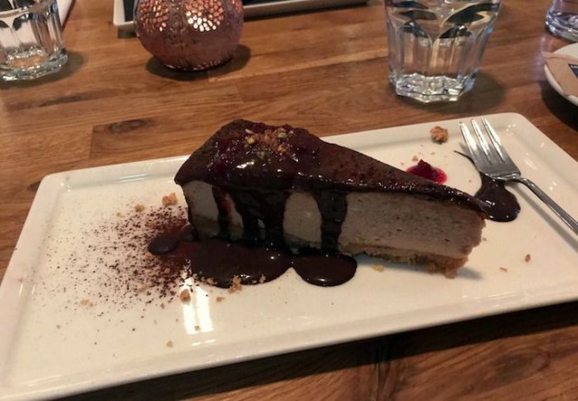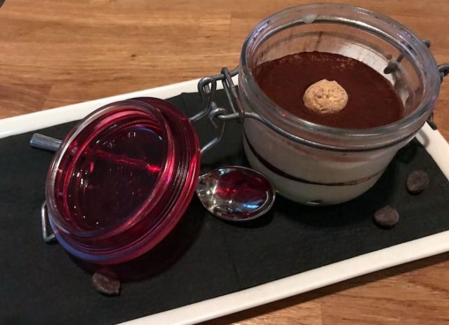 Vaikka olemmekin jo aika uhkaavan täynnä, on (tietenkin) pakko maistaa jälkiruokia. Tiramisu purkissa on hauskan leikkisä, aina varma valinta ja Pjazzassakin todella maukas. Päivän juustokakkuna on tarjolla iso pala Nutellasta mausteensa saanutta kakkua. Huh mikä määrä siinä on suklaata ja kaakaota!