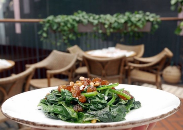 Ennen pääruokaa saamme maistiaisia pienistä, jaettavista annoksista, joista kuullotettu pinaatti rusinoilla on ilahduttavan trendikästä ja kevyttä. Kevyempien annosten ystävälle myös valkoinen parsa tryffelillä ja saksanpähkinällä toimii varmasti. Espanjalainen naposteluklassikko paistetut vihreät Padron-paprikat ilahduttavat meitä suuresti. Seuralaiseni tosin vinkkaa, että paprikoita olisi uskaltanut paistaa hieman reilumminkin.