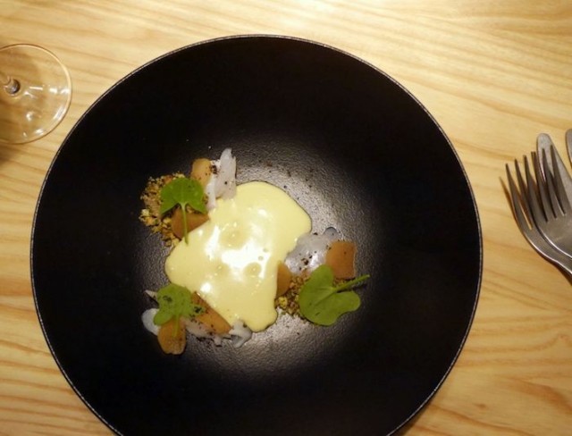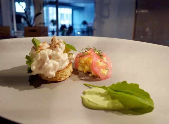 Pehmeälle briossille koottu hieman erilainen toast skagen kuului ehdottomasti iltaan. Klassikkoa oli raikastettu savukuivatulla tonnikalalla ja yrtticremellä ja sen kanssa tarjoiltiin puhdasta Rieslingiä. Tällaista kokonaisuutta sitä odottikin tästä ravintolasta ja tämän annoksen myötä odotukset myös täyttyivät.