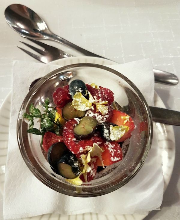 Alkuruoka-annokset katettiin Pentikin astioille, jotka olivat silmiähivelevän kauniita ja mukavan erilaisia. Saaristolaislautanen tuoksui kesältä ja hurmasi mauillaan. Kalojen lisukkeina tarjoullut pavut, herneet, kukkakaali ja ruusukaali olivat täydellisesti kypsytettyjä.
