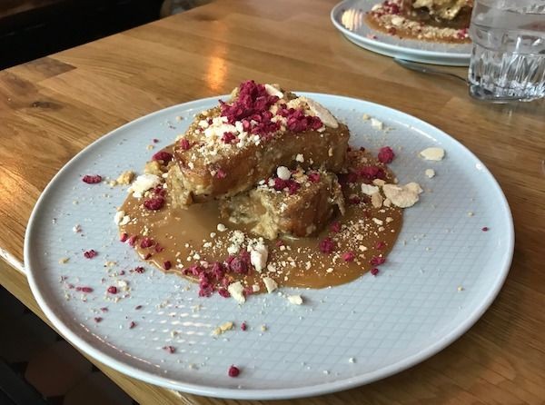 Ja vaikka luulin jo olevani ihan täynnä, katosi jälkiruoka sen suuremmitta ongelmitta. Hieman erikoisemmat köyhät ritarit olivat todella herkullisia, ja olihan tälläkin annoksella kokoa!