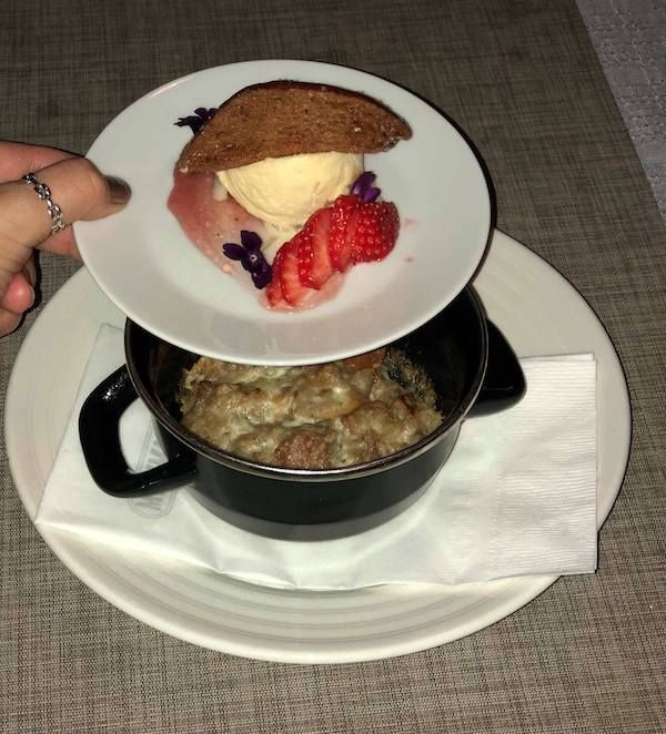 Ennen jälkiruokia meinasimme jo luovuttaa, mutta onneksi emme niin tehneet. Jälkkärit tulivat todella kauniissa ja yhtenäisissä esillepanoissa, joista pullavanukas tarjoiltiin hauskasti kahdessa kerroksessa.