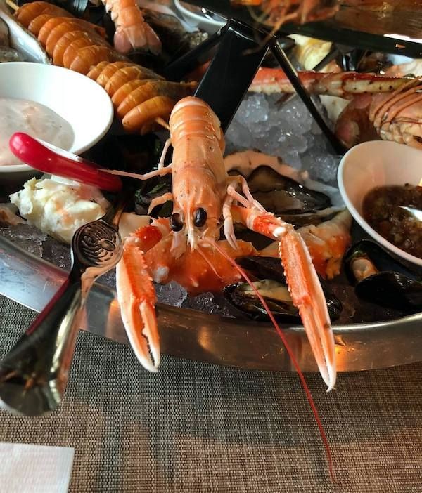 Vaikka alkuruoat olivat jo kaikki olleet varsin mainioita esityksiä, olimme aivan ällistyneitä nähdessämme pääruoaksi meille katetun royal seafood platterin, josta löytyi kuningasrapua, merirapua, tiikerirapuja, ostereita, katkarapua ja simpukoita, huh!