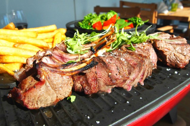 Pääruuan kanssa meinaa mennä sormi suuhun: puuhiiligrillistä valmistuu upeita kokonaisena grillattuja kaloja, jotka saattavat viereiseen pöytään tuotuna aiheuttaa vakavaa annoskateutta. Uteliaisuus vie kuitenkin voiton ja päädymme testaamaan Rugosan Mixed Grillin, joka on keittiömestarin erikoisuus 2-6 hengen seurueille. Mixed Grill tarjoillaan pöytään näyttävässä pöytägrillissä, joka pitää neljää erilaista lihaa sekä kasviksia ja ranskalaisia perunoita sisältävän lajitelman lämpimänä. Lampaan kare sekä naudan sisä- ja ulkofilee ovat kypsyydeltään täydelliset. Myös kana on mehukasta ja toimii hyvin erityisesti kastiketarjottimelta löytyvän tsatsikin kanssa. Vaikka meidän valintamme olikin lihaisaakin lihaisampi, todettakoon kuitenkin listalta löytyvän houkuttelevia vaihtoehtoja myös kasvisruokaa suosiville ja erityisruokavalioisille.