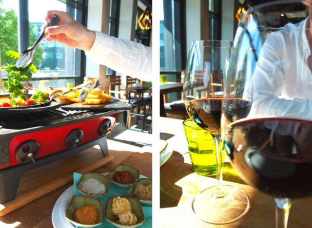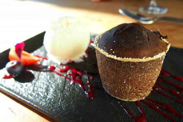 Jälkiruokaviineistä kysyttäessä Milkan silmät syttyvät niin, ettei ole vaikea arvata seuraavaksi olevan tiedossa jotain erityistä. Henkilökunnan suosiksi noussut Xarada Mistela Negra on tuotekuvauksen mukaan luumuinen ja kirsikkainen, mutta maistuu suomalaisessa suussa ilmiselvästi mustikalle. Kertakaikkisen upea viini olisi itsessään ajanut jälkiruuan aseman ongelmitta, mutta toisaalta enpä ole vielä eläessäni törmännyt tiramisuun, jota en haluaisi maistaa. Rugosan tiramisu on korkeudessaan komea ilmestys, sillä pehmeäksi uitetut savoiardinkeksit on korvattu ryhdikkäillä gluteenittomilla mantelikekseillä. Jos tiramisussa on hieman poikettu perinteistä, Saaren suklaafondant taas on valuvana ja syntisen suklaisena ylistys klassiselle ranskalaiselle keittiölle.