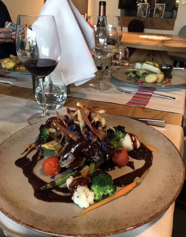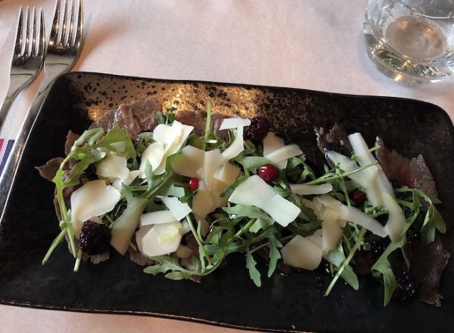 Kaerajaanin ruoka on modernia virolaista ja annokset reilun kokoisia. Vaikka pohja on perinteissä ovat annokset silti tätä päivää. Seurueestamme useammat valitsevat alkuun peuracarpaccion. Raikkaassa annoksessa liha on erinomaista, parmesaani toimii lisukkeena mukavasti ja sitä on lautasella riittävästi. Marjat tuovat annokseen hyvin happoja. Olemme kuitenkin yksimielisiä siitä, että näin hyvän lihan kanssa toimisi hieman vähempikin määrä kastiketta.