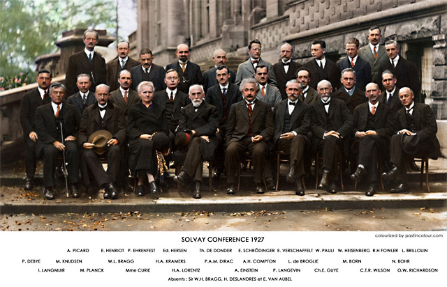 Solvay-konferenssit ovat tärkeitä modernin fysiikan kehittämisestä keskustelevia kansainvälisiä kokouksia. Lokakuussa 1927 järjestettiin viides ja kaikkein tunnetuin tähän astisista konferensseista. Tapaamisen aiheena olivat elektronit ja fotonit. Tuon ajan merkittävimmät fyysikot tapasivat keskustellakseen silloin vielä uudesta teoriasta, kvanttimekaniikasta. Näkyvimmät hahmot olivat Albert Einstein ja Niels Bohr. He ajautuivat sanaharkkaan, sillä suhteellisuusteoriastaan tunnettu Einstein ei pitänyt kvanttimekaniikasta, jonka yksi merkittävimmistä kehittäjistä oli juurikin Bohr.