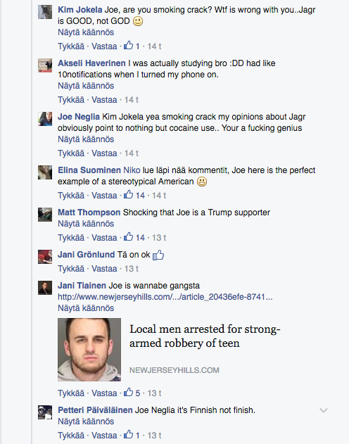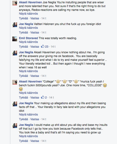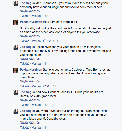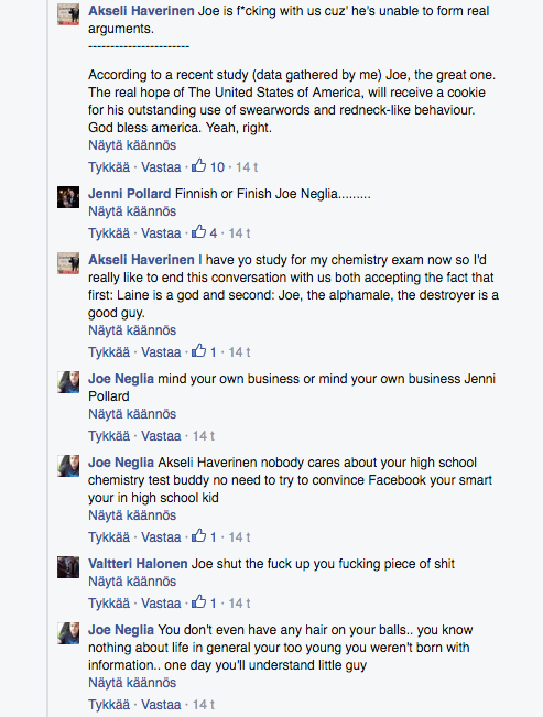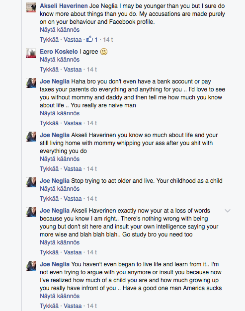“Vain koska hän on likainen suomalaisretku, niin kuin sinäkin, se ei tarkoita, että sinun tarvitsee tulla tänne vastaamaan minun kommenttiin omalla tyhmällä näkemykselläsi”, Neglia osoittaa argumentointitaitoaan.