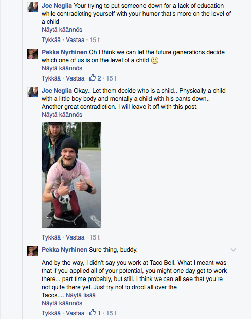 Kymmeniä viestejä myöhemmin kaveri on ehtinyt haukkua keskustelukumppaninsa iät (joko liian vanhoja tai liian nuoria), kommentoimaan heidän ulkonäköään (näytät lastenahdistelijalta tai sinulla ei varmaan kasva vielä munankarvatkaan jne.) ja sortumaan muihinkin ala-arvoisen keskustelun peruskikkoihin.