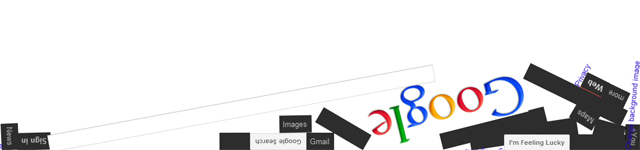 - Kirjoittamalla hakukenttään ”Google gravity” ja painamalla kokeilen onneani -nappulaa saat Googlen graafiset elementit tottelemaan painovoimaa ja tipahtamaan ruudun alareunaan palasiksi. Voit tarttua elementteihin ja viskoa niitä ympäriinsä. Tässä kikassa ei saa olla päällä hakuasetuksista Google Instant, joka näyttää hakutulokset jo kirjoittaessasi.
