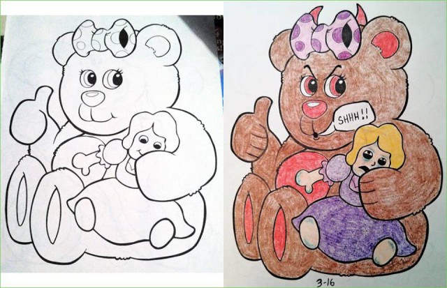 Lasten mielikuvitus laukkaa tunnetusti vilkkaasti, jonka vuoksi piirrokset ja leikit vaihtelevat laidasta laitaan. Myös aikuisten sisällä asustaa luova taapero, jonka huumori on hieman muuttunut vuosien varrella pimeämpään suuntaan. Seuraavat 14 kuvaa ovat lopputuloksia, joissa aikuisille on annettu tilaisuus värittää yksi kuva lasten värityskirjasta.