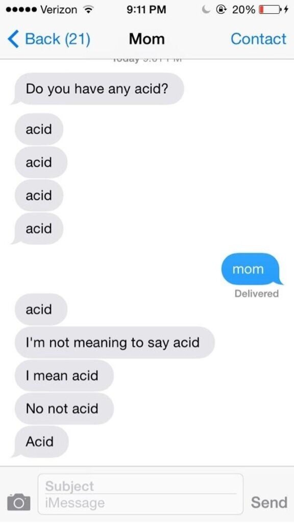 Kenzie-nimellä Twitterissä esiintyvä nuori nainen pisti äitinsä pinnan koetukselle. Hän sääti mutsin puhelimen tekstiviesti asetuksia siten, että aina kun äiti kirjoittaa ”dirty clothes” (likaiset vaatteet) puhelin korjasi tekstiksi ”acid” (happo, lsd-huumeen lempinimi). Tuloksena syntyi eeppinen tekstiviestikeskustelu.