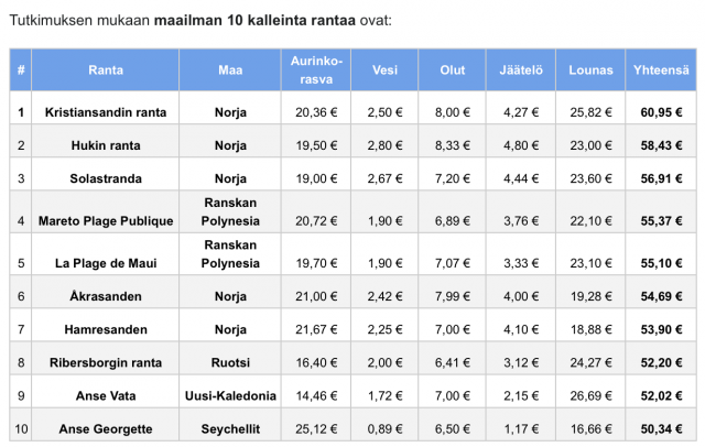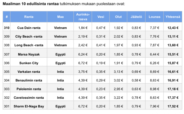 Online-matkatoimisto TravelBird on vertaillut yli 300 suosituimman rantalomakohteen hintatasoja, jotka on järjestetty rannalla vietetyn päivän kulujen mukaan. Kuluissa on otettu huomioon aurinkorasvan, veden, oluen, lounaan ja jäätelön hinta. Kärkisijaa pitävät Norjan ja Ranskan Polynesian eri kohteet. Edullisimmin pääsee Vietnamissa, Egyptissä ja Intiassa. Esimerkiksi eväät voi näissä kohteissa jättää kotiin, kun lounaan syöminen rannan omissa ravintoloissa on hyvää ja edullista.