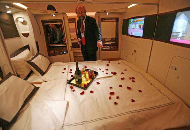 Parinkymmenen tuhannen euron lennolla voi pötkötellä sängyssä taulu-tv:n edessä, nauttia gourmet-luokan ruokailusta, kuunnella musiikkia huippulaatuista kuulokkeista ja kostuttaa kurkkua Dom Perignonilla tai maailman parhaimpiin kuuluvilla kahvi- ja teelaaduilla.