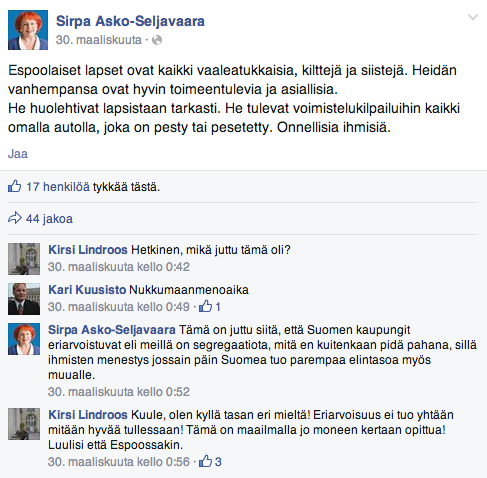 Tämä on suhteellisen viatonta, missikisat suhteellisen naurettavat ja tuskin “vaalea leidikään” olisi tuonut menestystä Miss Universum -skaboista. Asko-Seljavaara ei kuitenkaan ole vain viihdekilpailuiden kommentaattori. Huomattavasti kiinnostavampia ovat hänen muut lausuntonsa. Kuten tapa, jolla Lauttasaaressa asuva plastiikkakirurgi-poliitikko antaa espoolaisille kasvot.
