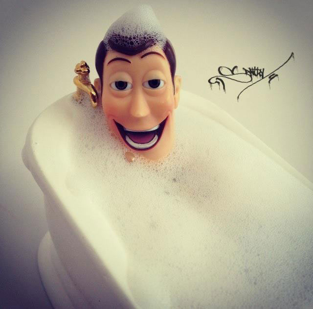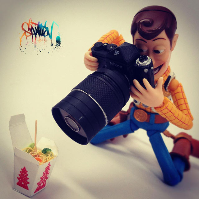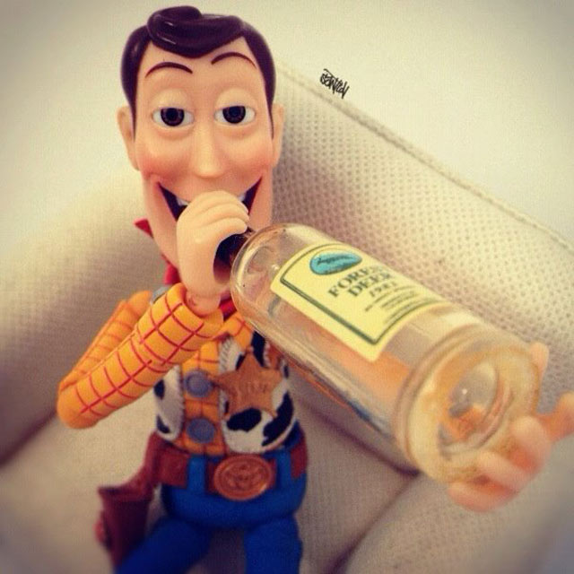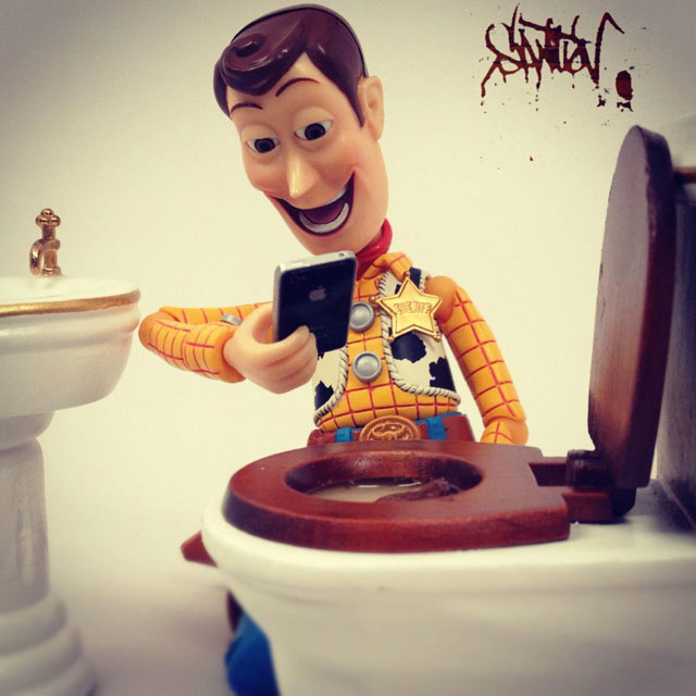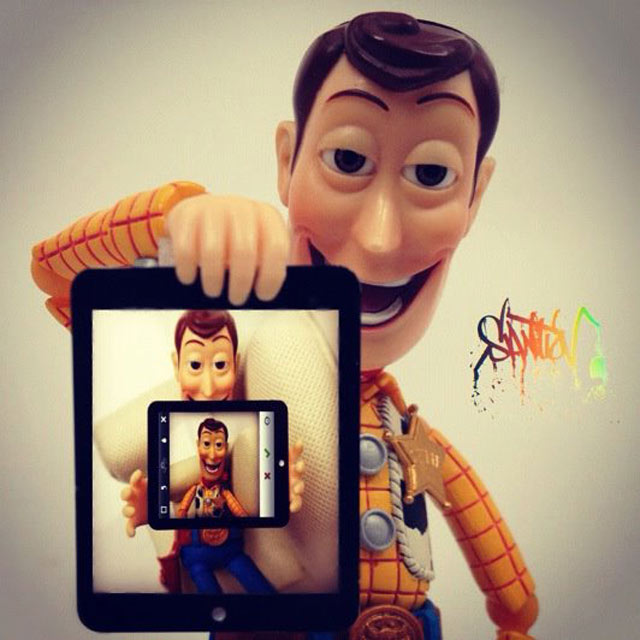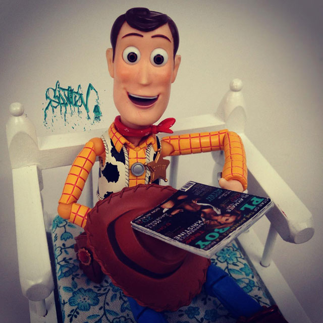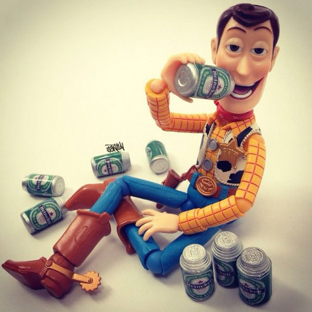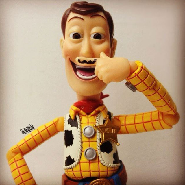 Santlovin kuvissa seikkailevat mm. Darth Vader, kapteeni Jack Sparrow, Heath Ledgerin Jokeri ja Jack Skellington Painajainen ennen joulua -animaatiosta. Eniten kuvia on Disneyn Toy Story -hahmosta, Woody-cowboysta. Woody juo Heinekenia, käy vaahtokylvyssä, fanittaa Steve Jobsia, ottaa valokuvia ruoka-annoksistaan ja polttelee vesipiippua. Hahmo tekee siis kaikkea, mitä ihmisetkin tavallisesti tekevät.