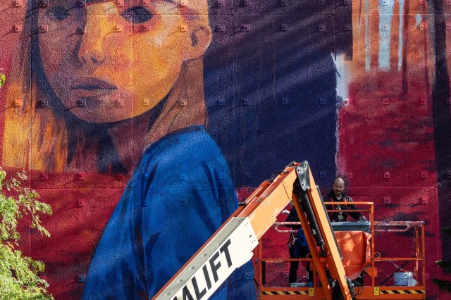 Matinkylässä fotorealismin kärkinimi Case Maclaim maalasi 7-kerroksisen asuintalon julkisivuun näyttävän muraalin.