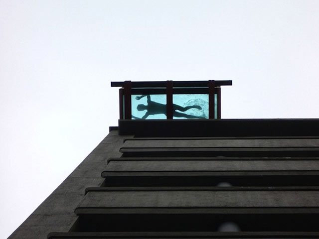 Shanghain Holiday Innin sisäuima-allas tarjoaa näkymät 24-kerroksisen rakennuksen huipulta. Yläkerroksissa on useinkin uima-altaita, mutta harvoin ne sijaitsevat rakennuksesta työntyvässä ulokkeessa, jossa on lasipohja.
