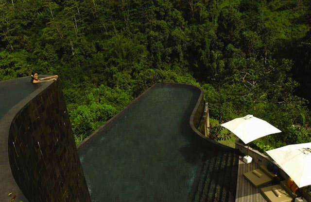 Indonesian Balilta löytyy luksusluokan altaat. Ubud Hanging Gardenin altaissa voi ihailla Pura Penataran Dalem Segaran temppeliä. Privaattialtaita on yhteensä 38 ja niihin pääsee, milläpä muullakaan kuin, ilman läpi kuljettavalla köysiradalla.
