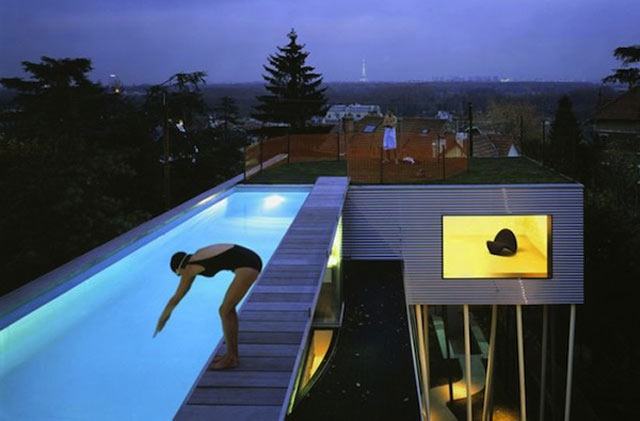 Tässä asuintalossa katto on muutettu tyylikkääksi uima-altaaksi. Huomaa myös vihreä katto rakennuksen toisessa osassa.