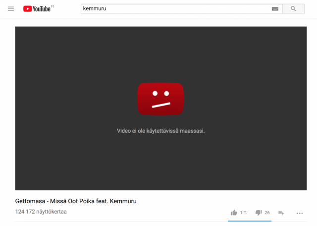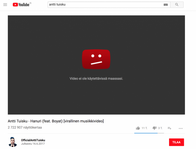 Hi there, we were unable to reach a new licensing agreement with TEOSTO. Because of this, some videos containing music will be blocked in Finland. Here's more info: https://t.co/5kGYH19RUn