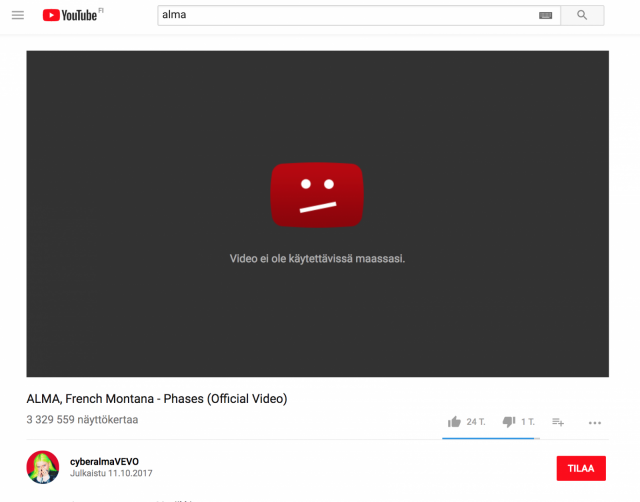 “Tietyistä kappaleista” puhuminen kuulostaa nopean tarkistuksen perusteella vähättelyltä. Tietysti vaikka kaiken suomalaisen musiikin poistaminen on Youtuben kokonaisuudessa pieni juttu, mutta suomalaiseen musakenttään rajoitus näyttää osuvan täysmääräisesti. Poistuneiden listalta löytyy artisteja Almasta Antti Tuiskun kautta Kaija Koohon ja levy-yhtiöitä pienimmistä suurimpiin.