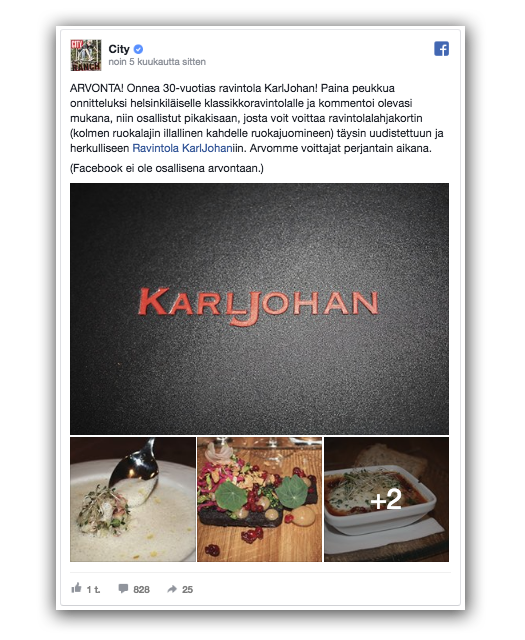 Cityn sometilit ovat erinomainen keino lisätä ravintolasi näkyvyyttä ja tunnettavuutta. Cityllä on Facebookissa aktiivinen seuraajajoukko, ja Cityn Facebook-tili tavoittaa viikossa kymmeniä tuhansia silmäpareja.