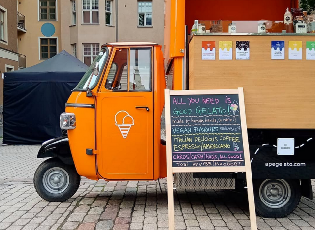 Pienestä oranssista myyntiautostaan tunnettu Ape Gelato on todellinen kesäpäivän piristys. Saatavilla olevat jäätelöt vaihtuvat päivän mukaan ja tarjolla on aina myös vegaanisia vaihtoehtoja. Kokeilunhaluiset valitsevat tötteröönsä astetta harvinaisempia makuja, kuten viikunaa, mangoporkkanaa tai kirsikkaista Mamma Mariaa.