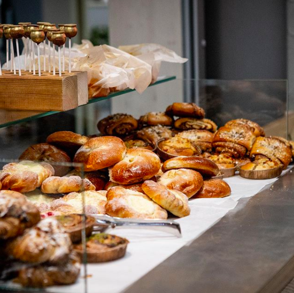 Useita leipomotuotevaihtoehtoja, kuten croissantteja, leivoksia ja erikoiskahveja.