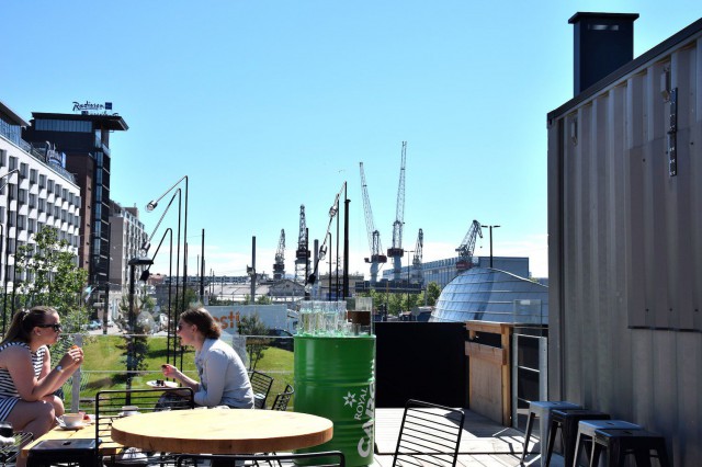 Kiasmalta Ruoholahteen kulkevan Baana-pyöräilytien Ruoholahden päästä löytyy aarre. Se kantaa nimeä Cargo Coffee & Kitchen ja se tarjoaa aurinkoisen keitaan kesäpäivän aamukahville, lounaalle tai iltabisselle.