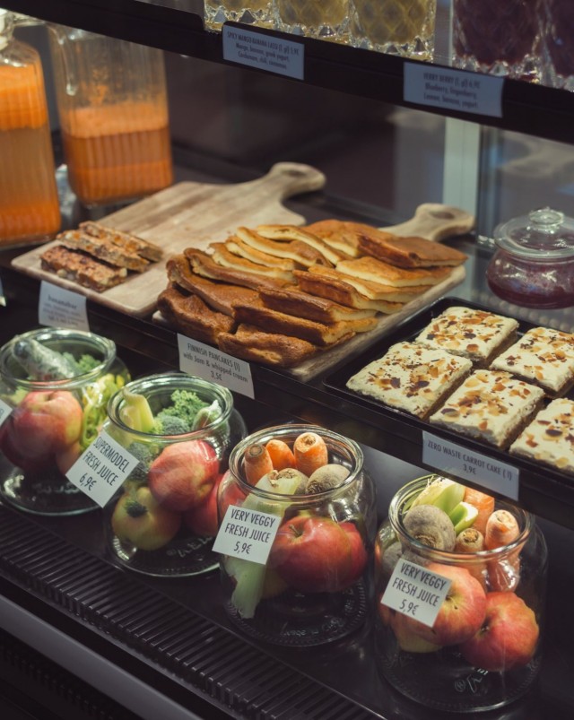 Hauskassa ja terveellisessä mehussa on muun muassa lehti- ja parsakaalia, selleriä, kurkkua ja omenaa. Mehut tehdään tilauksesta, ja raaka-aineet ovat esillä purkeissa vitriinissä.