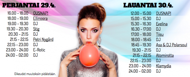 Rautatientorilla 29. huhtikuuta – 1. toukokuuta järjestettävässä Stadin Vappu -tapahtumassa nähdään liuta kotimaisia eturivin artisteja: Petri Nygård, Stig, Klamydia, Santa Cruz, Tiisu, Asa & DJ Polarsoul, Evelina, Ellinoora ja OUSNAP!.