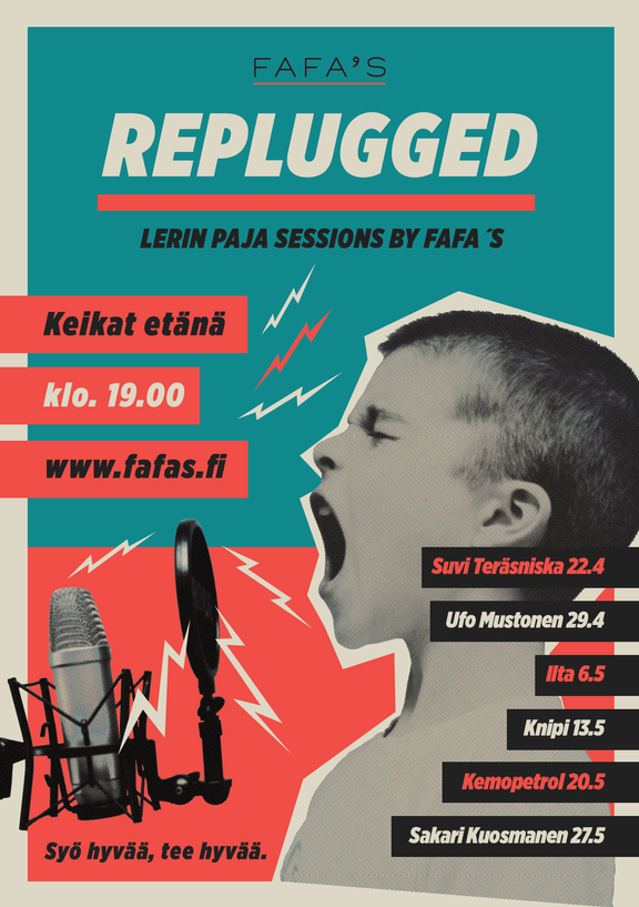 Fafa’s Replugged @Lerin paja on Leri Leskisen juontama Tiny Desk Concert -tyylinen musiikkiohjelma, joka välitetään Leskisen studiolta. Konserttisarjan pääsee aloittamaan Suvi Teräsniska 22.4. Sitten esiintyvät Ufo Mustonen 29.4., Ilta 6.5., Knipi 13.5., Kemopetrol 20.5. ja Sakari Kuosmanen 27.5.
