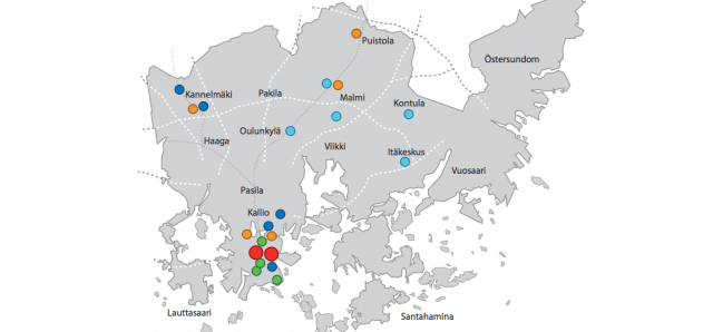 - Ostoskeskukset: Oulunkylä, Ylä-Malmin tori, Pihlajamäki, Kontula, Itäkeskuksen kauppakeskus ja Tallinnanaukio