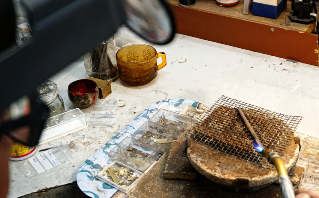 “Kaikki tapahtuu niin sanotusta romukullasta. Ensin jaotellaan eri pitoisuudet erikseen, sitten sulatetaan harkoiksi. Sen jälkeen harkkoa aletaan työstää erilaisilla valsseilla ja vasaroilla. Yleensä tehdään sormus. Ollaan me tehty paljon muutakin, esimerkiksi kultainen puttimaila, jota käytetään golf-kentällä”, Suninmäki kertoo pajasta, josta löytyy vuosikymmenten kokemus jalometallien käsittelystä.