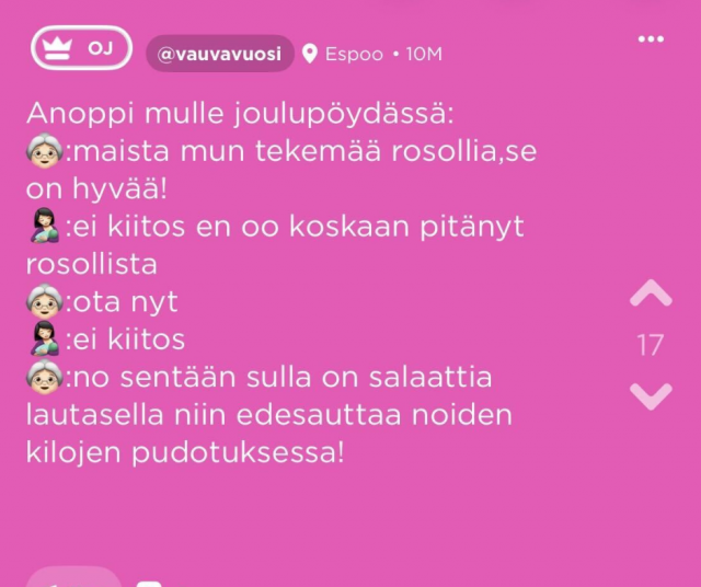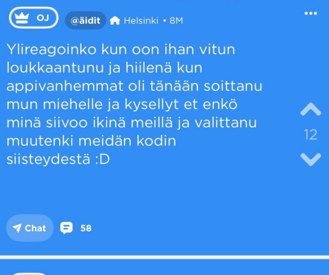 “Ei mieheni äiti vaan omani – hänelle ei voi kertoa yhtään mitään, koska kaikki asiat kerrotaan kylille suurella nautinnolla. En ymmärrä, miten hän voi olla niin kahtiajakoinen: kasvokkain hän on herttainen ja lämmin, mutta heti selän takana hän juoruaa kaiken eteenpäin. En voi käydä siellä ollenkaan, koska tiedän, että hän keksii aina jotain sanottavaa. Viimeksi hän sanoi, että olen varmaan masentunut, kun en ollut pessyt hiuksia viikkoihin – vaikka olin vain menossa hakemaan lapsen lelua. Hän väittää kaipaavansa lapsia, mutta minulle alkaa riittää.”