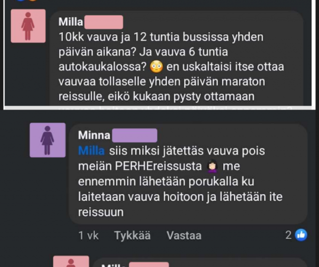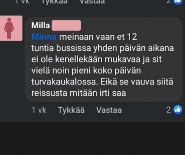 Luonnollisesti matkan kesto eli 12 tuntia saman päivän aikana bussissa herättää ihmetystä kommentoijissa.