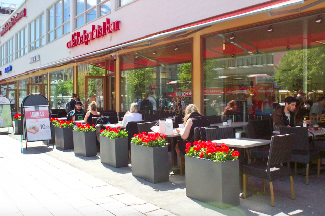 "Etenkin, jos haluaa terassille auringon perässä, kannattaa tulla aamulla. Mutta lounasaikaankin saa vielä istua auringossa."