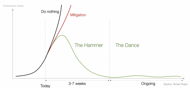 Pueyon The Hammer and the Dance -otsikoidussa jutussa suositeltu tiukka, mutta lyhytkestoinen taistelu virusta vastaan on kuin koronaa lyötäisiin vasaralla päähän. Tiukat rajoitukset auttavat kääntämään viruksen kurssin aikaisessa vaiheessa, jolloin on mahdollista säästyä moninkertaisilta kuolinluvuilta. Ravintoloiden ja kauppakeskusten sulkeminen kuuluu strategiaan.